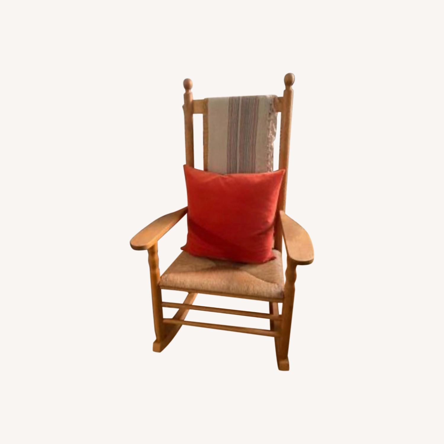 Seller's Notes:Beautiful, natural wood and wicker rocking chair. Wicker is in perfect condition, hardly used! Arms and legs of chair have some fading from wear over time. Could be conditioned and spruced right back into shiny shape! I LOVE how boho this piece is! Perfectly eclectic for my space. I decorated with a bright velvet pillow, throw, and some favorite hooks.