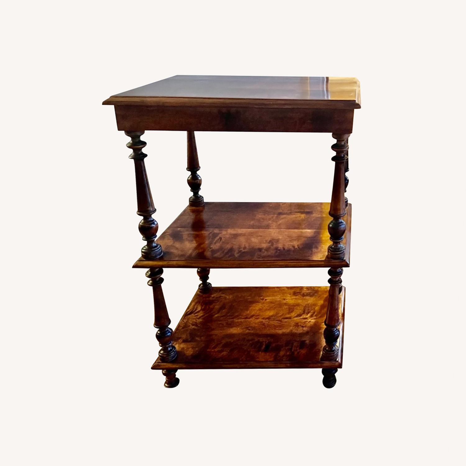 Seller's Notes:We purchased these sturdy, space-saving tiered tables at Green Street Antiques in Soho, New York in 2006. These also work well as simple book shelves. They have a beautiful, warm finish and turned wood column accents. First picture looks a little funny suggesting paint missing but there is no paint missing or markings. These are in excellent conditions and friends keep asking why I’m selling! Dimensions: 18.5” Wide x 14” Deep x 30” High. Second tier 11 7/16” high and bottom tier 11 1/4” high. Material: wood Style: Biedermeier These shelves are stable and in excellent condition with no scratches or stability issues, but I must select Good Condition since these are not new shelves.