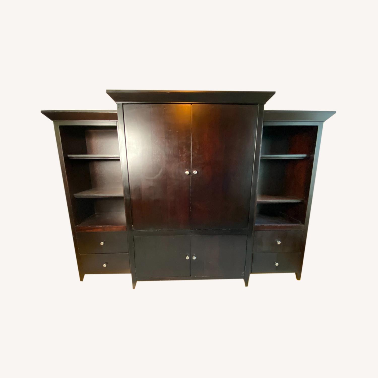 Seller's Notes:Matching wooden three-piece cabinet and shelves, featuring a large middle unit that can fit a 41" TV and separate side units with storage. Dimensions: Center Unit: 48" Width x 66" Height x 23" Depth Side Units: 24" Width x 62.5" Height x 18" Depth Condition: Good -- A few light scratches that aren't too noticeable.