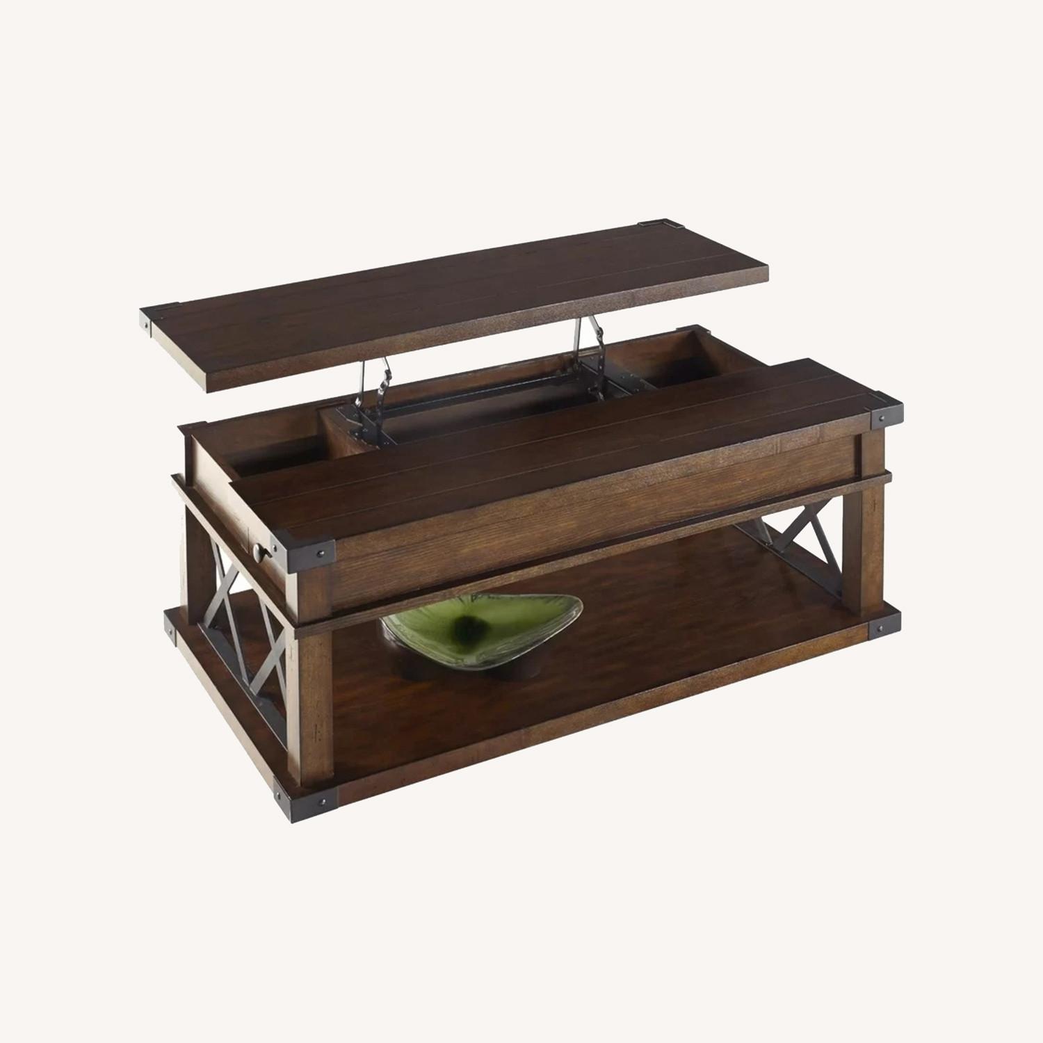 Seller's Notes:We love this coffee table and are only giving it up because it doesn't work in our new space. It's very sturdy and only has one small blemish (see photos) on the top. One of the wheels is a little wobbly but we don't roll it that often so it hasn't been an issue. The lift top is great for eating dinner or being WFH, and you can store a ton on this table. The child safety covers on the corners will be removed before we send this off to whomever buys it.