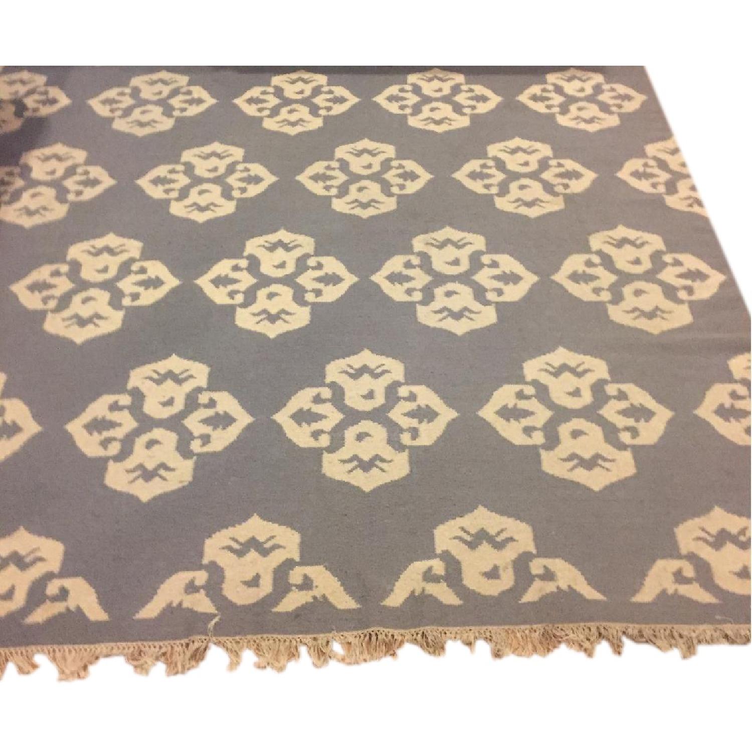 Seller's Notes:8.3' x 10' flat-weave wool rug. Reversible to either side, in grey with cream medallion design.