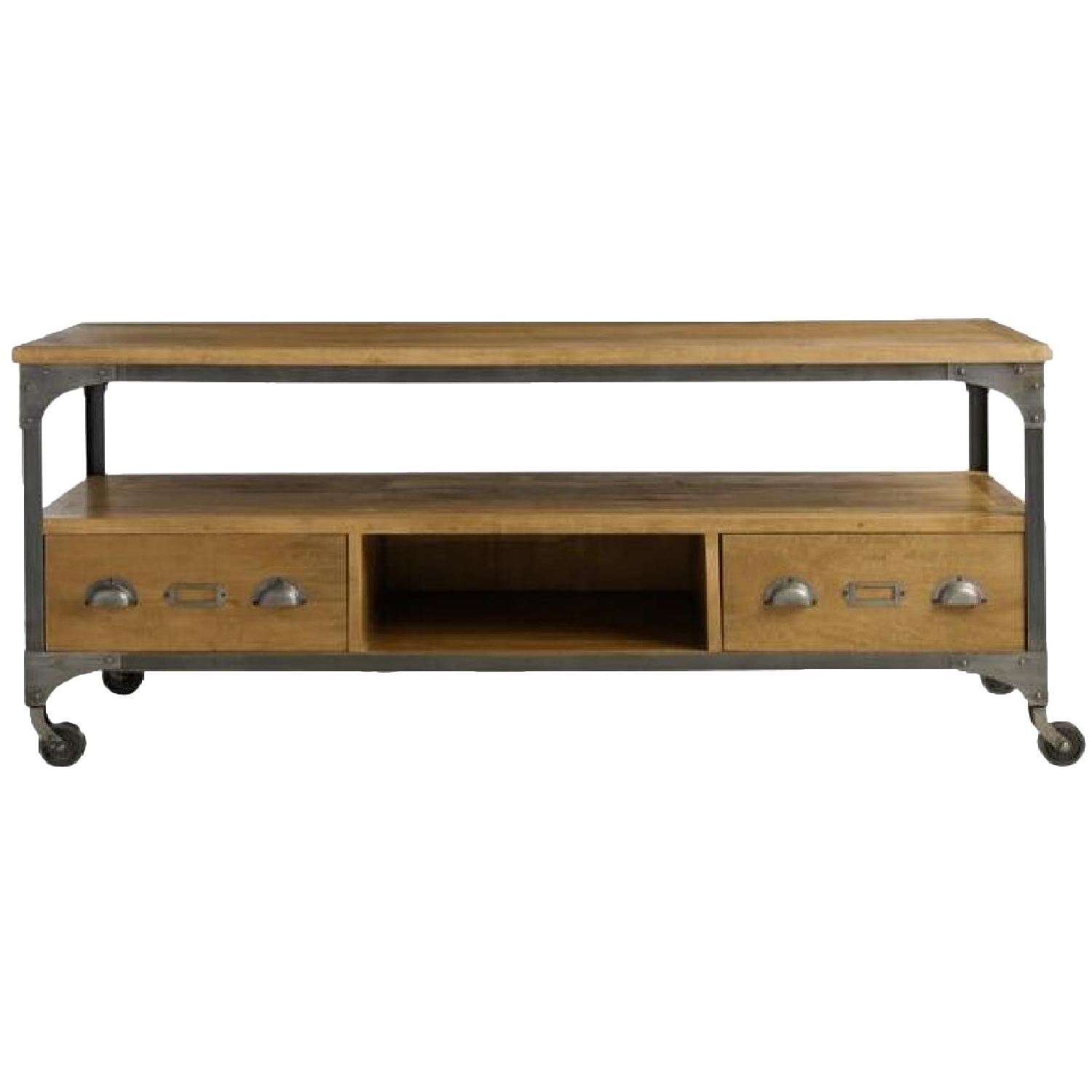 Seller's Notes:I love this table, it has wheels! And storage! And it is gorgeous. This was a big purchase for me and almost exactly a year later I am moving across country and it can't come with me. But I love love it and I know you will too. It is big but mobile and so versatile and sytlin. It was sent to me slightly damaged on the corners. I did not send it back because it was a beast to ship and I hadn't noticed it in time. When we were putting it together, we had to bang out the metal corners in order for the legs to fit through on two of the four legs. That left some marks and character, which I took pictures of. I included all four corners in the pictures for you to see. One is particularly banged up but after putting it together I never noticed it again and it didn't affect the wheels working just fine. The plus is you will not have to deal with putting this together cause it ain't easy! From the retailer: Our media shelf gives your space a rustic, industrial feel with its mango wood surfaces, and metal accents like library-style drawer pulls and locking caster wheels. It offers plenty of storage space for all of your media components with two drawers, a cubby and a bottom shelf.