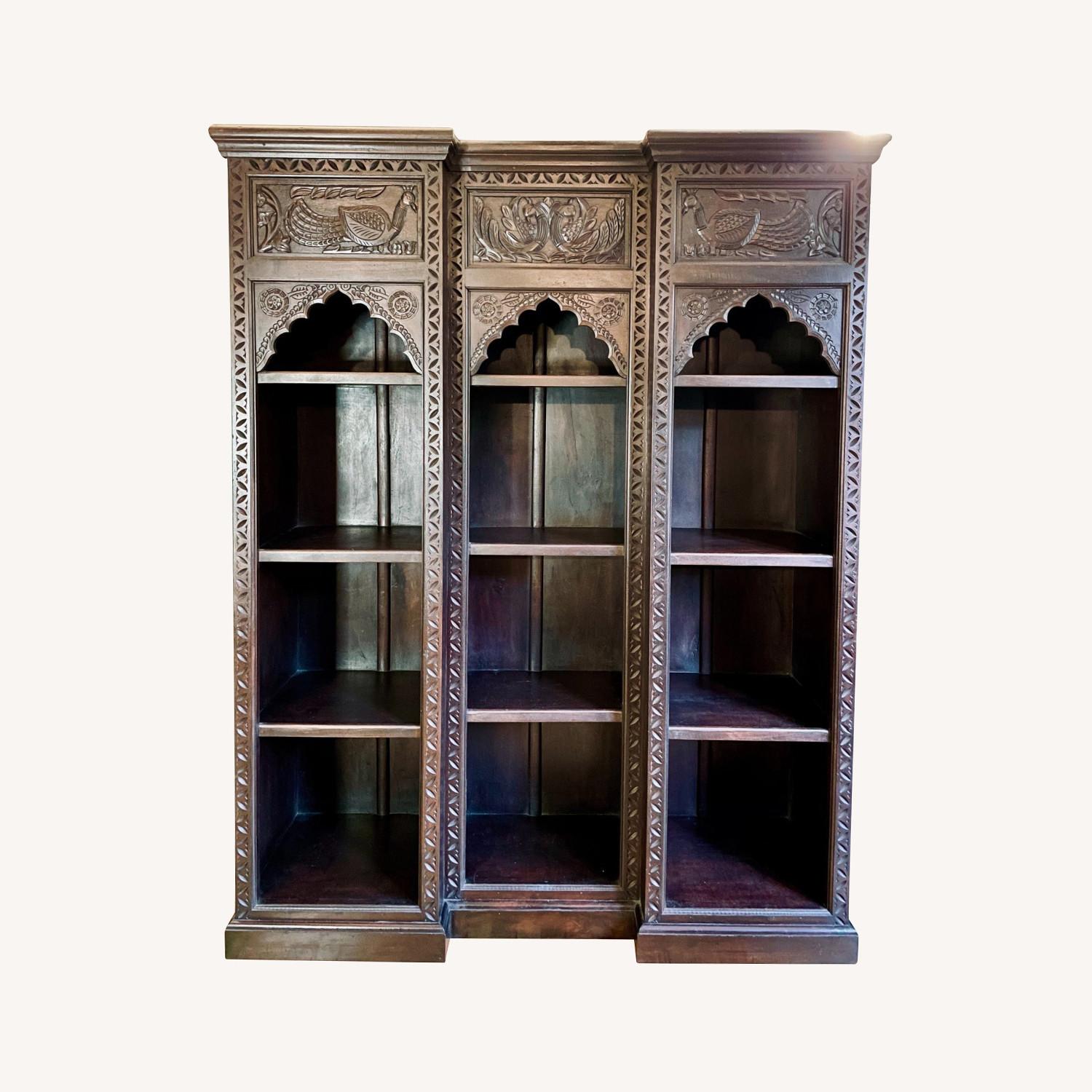 Seller's Notes:We are moving and need to sell our beautiful World Market bookcase. It is made of solid wood and is stained dark brown with a warm hue. It has hand-carved foliage and peacock designs as well as arched openings at the top for books or decor. There are some scuff marks on the side (pictured) that could be easily treated. If you prefer to save on the delivery fee, please be advised that the bookcase is heavy and would need to be brought into the service elevator and then up about eight stairs to street level.