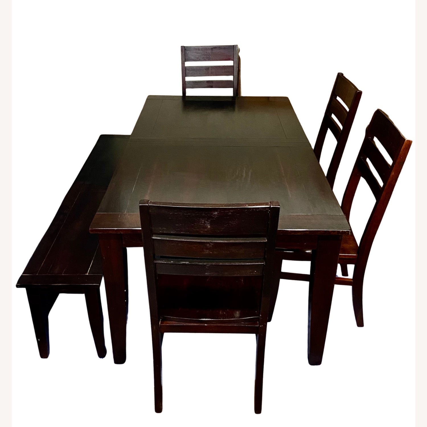 Seller's Notes:Hi, this dining room set is so beautiful and was a center in our home, but since we moved to the city we can no longer fit it in our place. It has since been moved to a storage unit and we would love for another family to enjoy. It is a beautiful dark wood table that comes with 4 chairs and 1 bench. It also has a leaf that easily inserted to provide even more space. Normally you can seat about 6-7 people but with the leaf, it provides another 2-3 seats! It is in great condition and has few minor scratches. The wood itself was made to keep the natural look so some of the curves and indents are from the wood itself and not blemishes. The seat on the chairs is curved to mimic the roundness of legs and makes it more comfortable to sit on. Dimensions: Dining room table - 6’Lx40”Wx30”H Comes with: (1) Dining bench - 70”Lx14”Wx18.5”H (4) high back chairs - seat 18”x17”, chair back is 2ft tall from seat/comfortable leg indents on chair (1) Leaf 12” wide