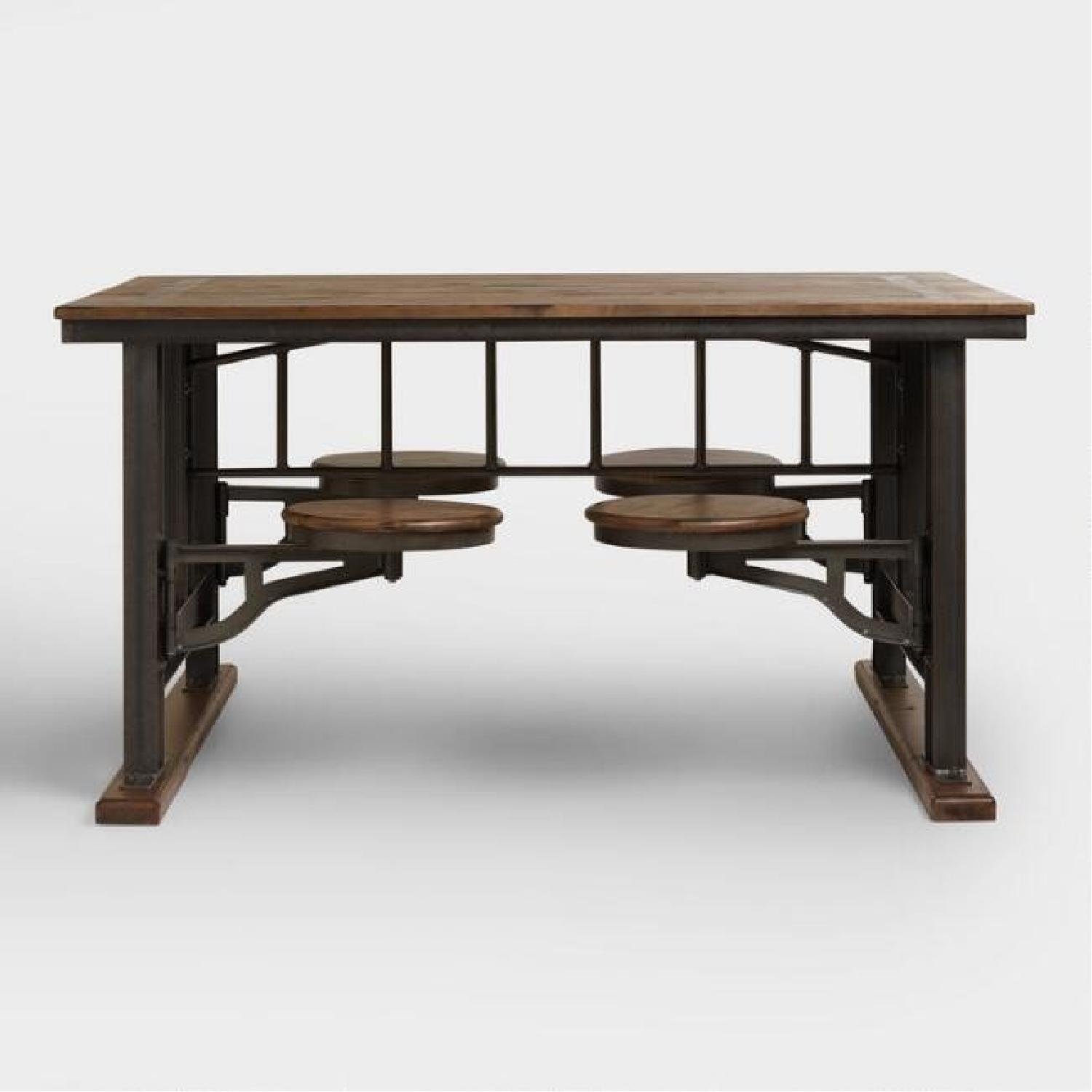 Seller's Notes:So, I absolutely love this table. I had been stalking it at the store for a full year before I made purchased it, but it was well worth it. Such a beautiful piece of furniture! The great thing is that it can be used as dining table or a work table (lots of surface space to stack your papers). There are also four swinging stools, so that saves on space, (you don't need chairs taking up valuable floor space). But then, if you so wish, you can add a stool to each end of the table and voila your four-seat stylish table can now seat six! I hate to part with this table, but I'm preparing for a big move and so I've decided to travel light. It's an awesome piece, one a kind; great if you like that industrial vibe! The table itself is rustic/industrial in style, so the table top, (a plank of wood) has a couple scratches and there are slight variations in the wood and metal (this is intended). All in all, this is a great value. The table itself retails for 799, but when then they add freight and shipping, tax, etcetera, the price climbs to over a thousand dollars retail. It's a big, sturdy piece of furniture that will last forever. Also, I will take it apart in as few big pieces as possible, so it'll be a breeze to put back together again.