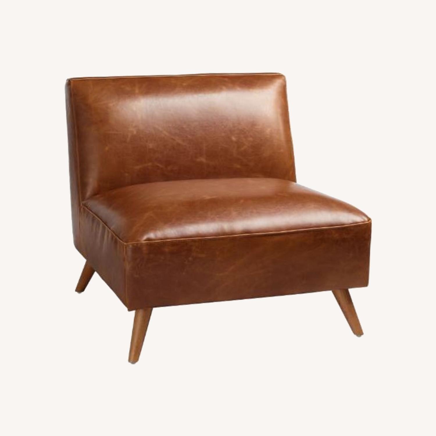 Seller's Notes:Warm and welcoming, the Huxley chair features an oversized seat and clean armless silhouette, equally perfect for snuggling and creating a statement. Dressed in warm cognac-brown bi-cast leather, this mid-century chair's easy good looks will make it at home in an array of decor styles.