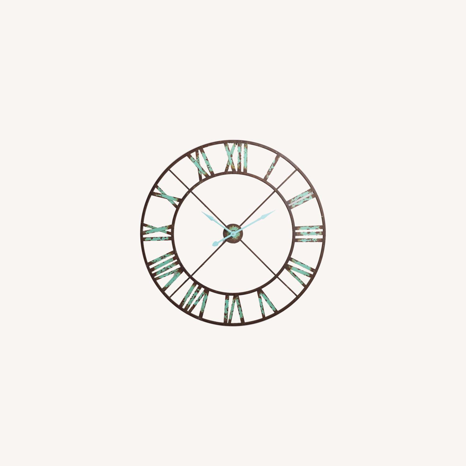 Seller's Notes:A bold statement piece for the kitchen or living room, our oversized iron clock is finished in black with vintage brown and aqua distressing for architectural salvage appeal.