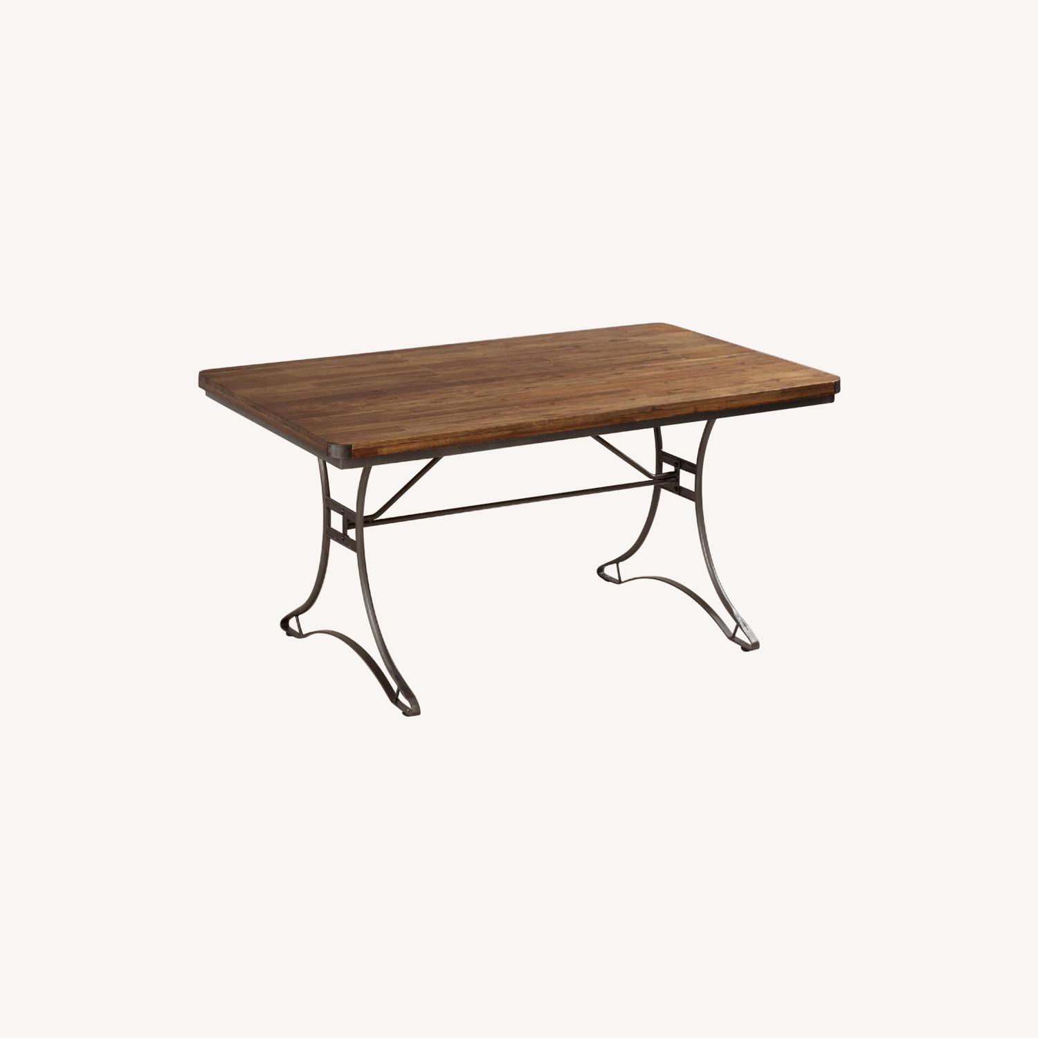 Seller's Notes:This modern industrial table features curved metal legs and a slat-style acacia wood tabletop. Mild markings/distress on the table top as pictured. We've used this table for board games and dinner parties, and love it. We are moving to France and can't take it with us!