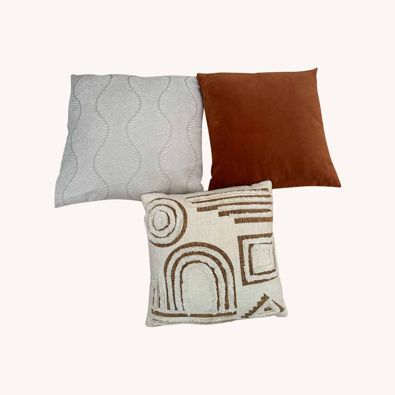 Seller's Notes:3 decorative throw pillows - Inserts included Copper Velvet Throw Pillow - 18"x 18" Ivory Ogee Jacquard Throw Pillow - 20" x 20" Ivory And Gold Tufted Abstract Throw Pillow - 18" x 18"