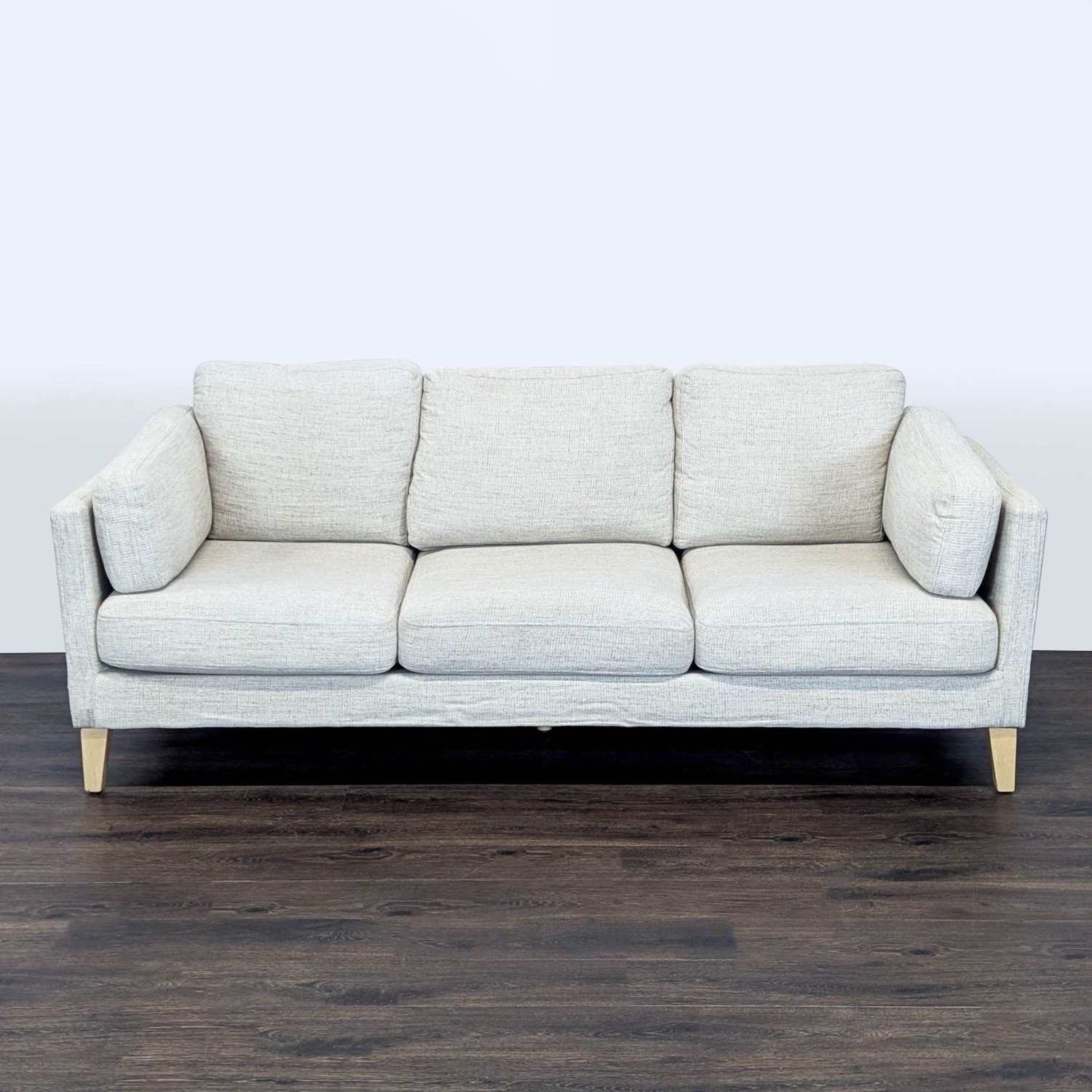 Seller's Notes:This 3-seat sofa features a clean, modern design with light gray upholstery and sturdy wooden legs. The thick seat and back cushions offer great comfort and support. Perfect for living rooms, offices, or any space that needs stylish seating. The neutral color blends easily with any decor.