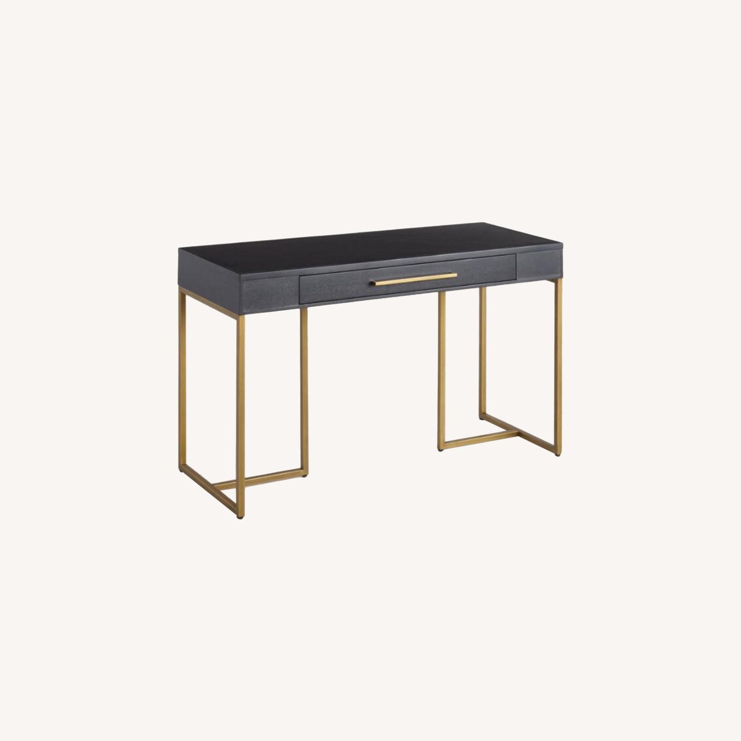 Seller's Notes:This sleek desk features clean lines, a smooth writing surface and one wide drawer. The hardware is finished in an antique brass tone with a subtle herringbone pattern on the desktop. Please help me find this desk a new home! I am leaving NY and unfortunately can't take this desk with me in my move. Thank you for considering! Leg height: 24.5"H Between outer legs: 45"W Between inner legs: 20"W Drawer: 29.75"W x 13.25"D x 2.25"H