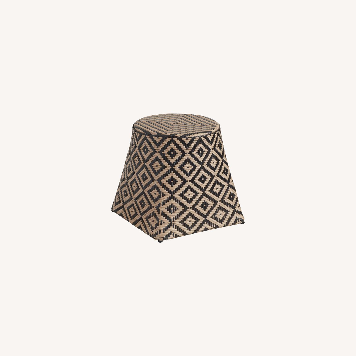Seller's Notes:World Market Two Tone All Weather Wicker Harare Outdoor Stool Specifications Crafted of iron and all-weather resin wicker Comes fully assembled Wipe with damp cloth and dry Cover or store away during inclement weather; see our selection of Outdoor Furniture Covers, sold separately World Market exclusive Overall: 18.75"Dia. x 17.5"H, 37 lbs. I feel in love with this stool since it was perfect for my Dracena plant that i had. It would look great indoors or outdoors. Please see image of area where the wicker is loose.