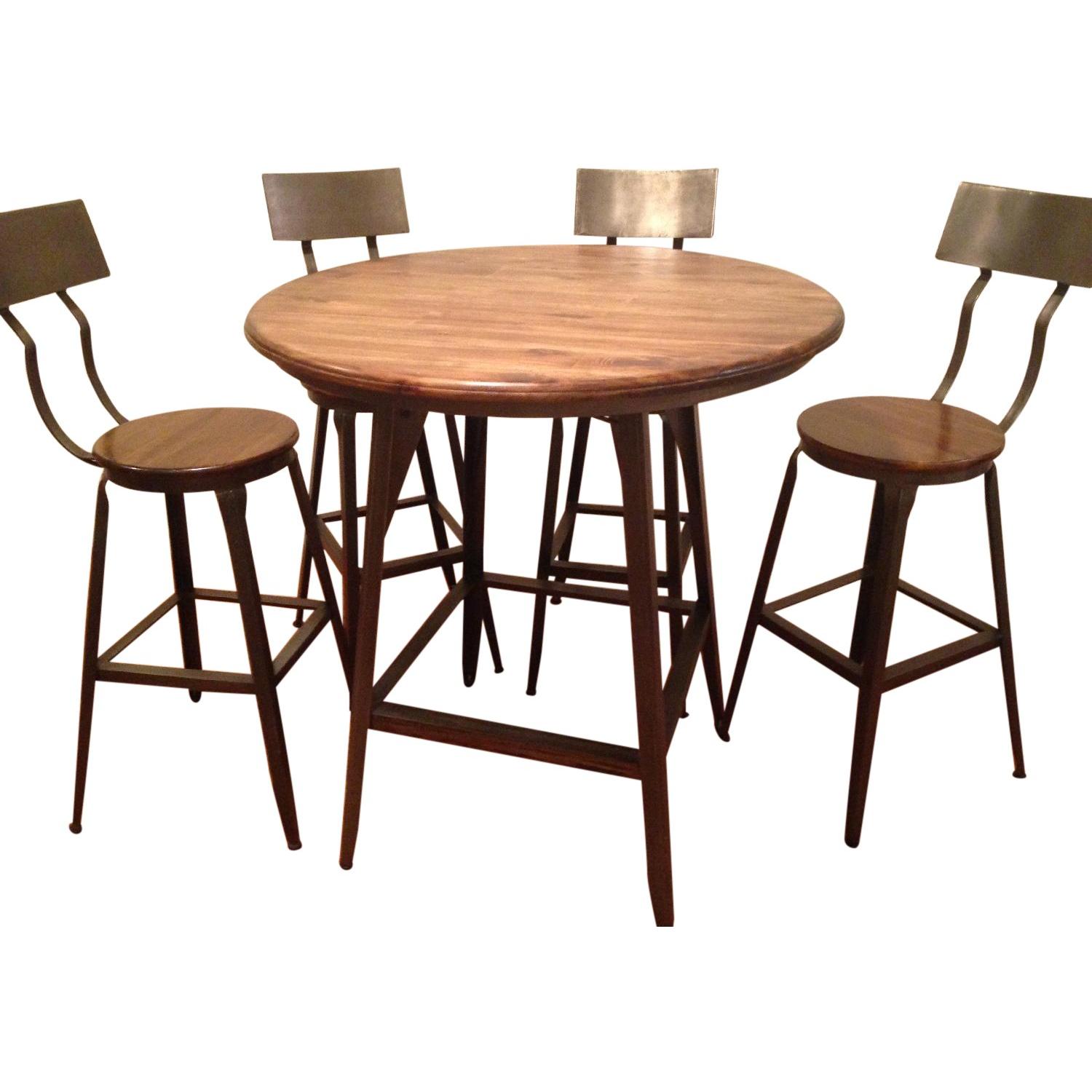 Seller's Notes:Beautiful acacia pub table and set of four bar-height stools from World Market - all in great shape! Sturdily built, all with adjustable feet so you can stabilize them on uneven NYC floors... One chair's surface is slightly chipped (shown); the others are like new. We love the look of this set, but we just moved and they don't work in the new place. If you're interested in the pieces separately, feel free to reach out!