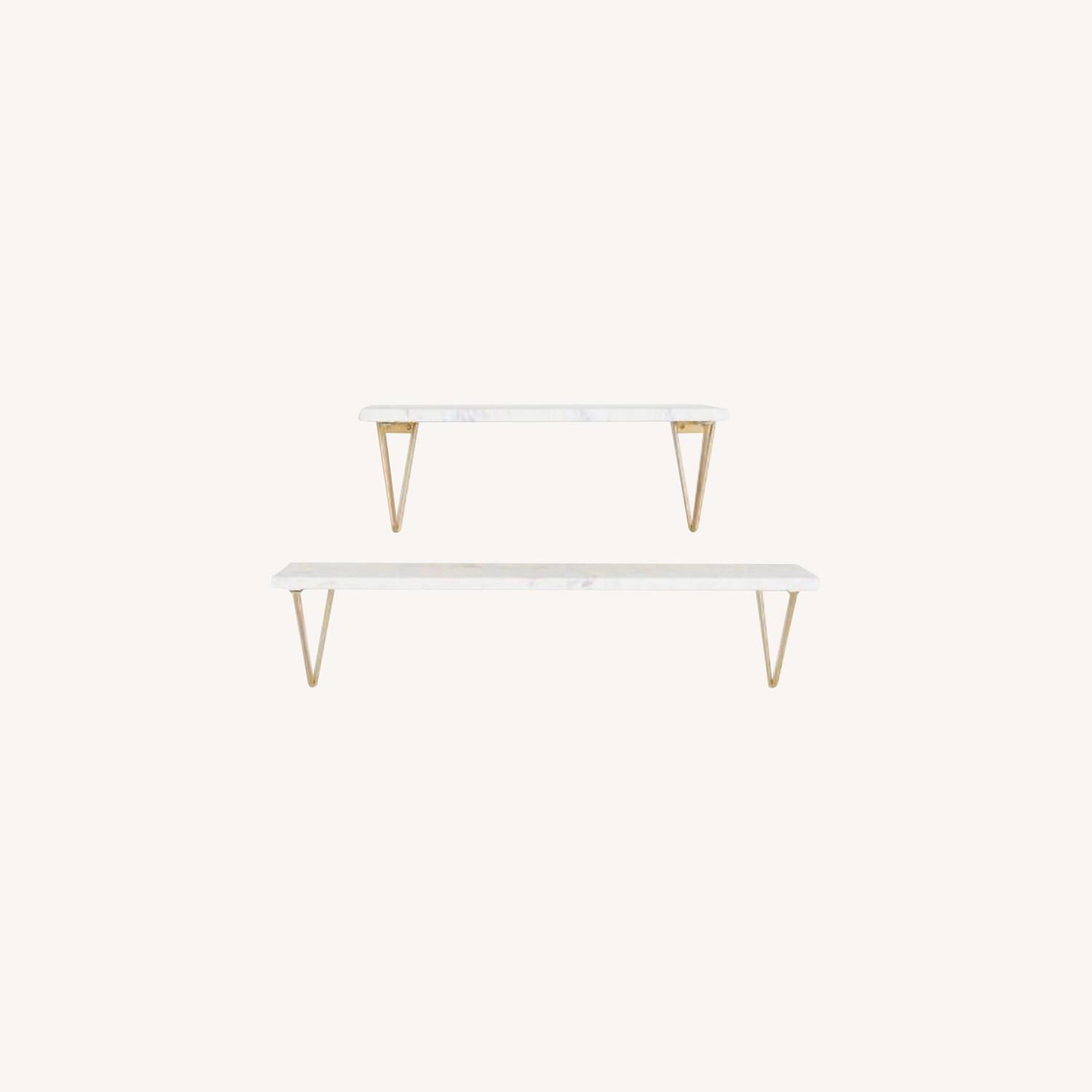 Seller's Notes:These are gorgeous white marble shelves on gold brackets! Purchased from World Market. I’ve had them on my gallery wall. I’m redecorating and selling as a set of 3, or separately. **The listed price is for each separate shelf** Specifications Crafted of white marble For use with World Market Mix & Match Shelf Brackets only Due to natural materials, slight variations will occur Wipe clean with a dry cloth World Market exclusive Made in India Assembly required 3-ft. shelf: 36"W x 8"D x .75"H, 23.85 lbs.; max load: 10 lbs.