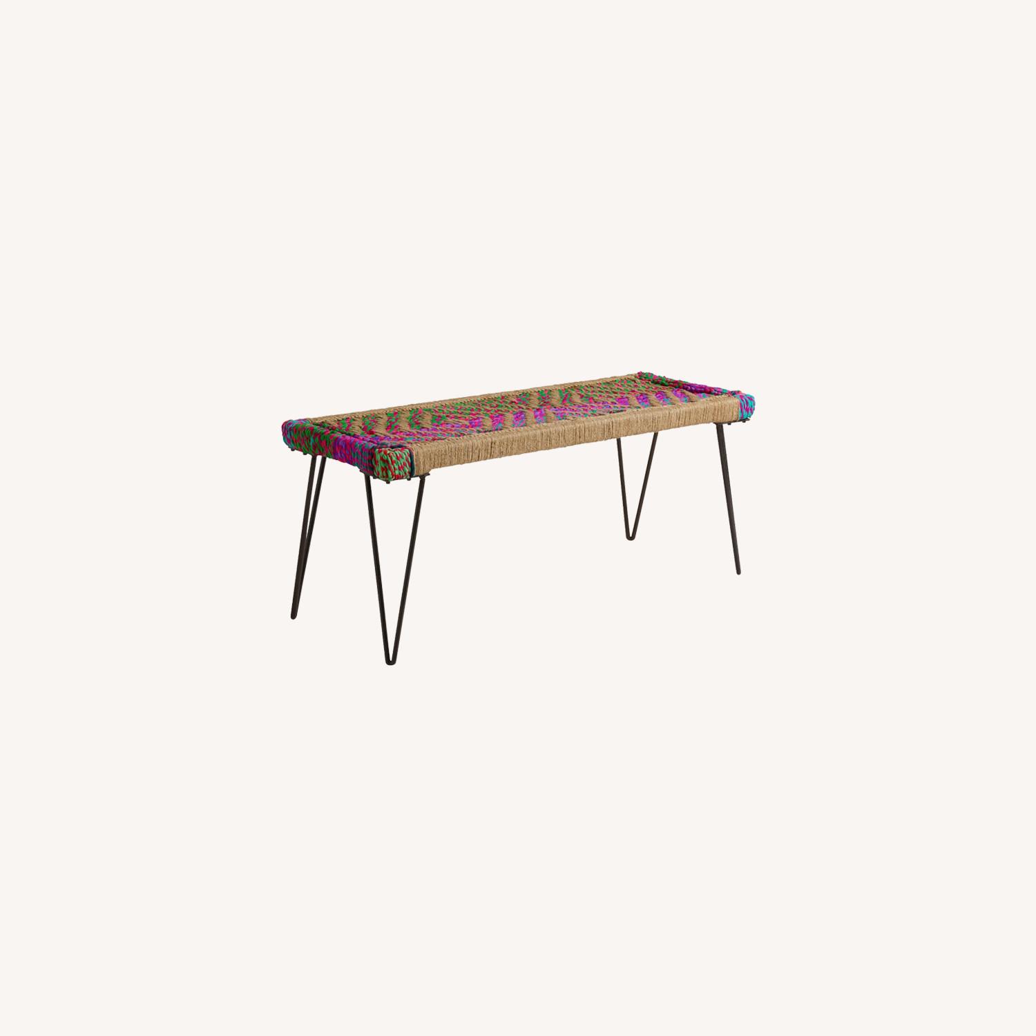 Seller's Notes:Built using simple, modern lines, this eclectic Chindi bench nods to the vibrant and colorful culture of India. Chindi is a sustainable design tradition that repurposes leftover fabric into practical home items. Handmade in Jodhpur, no two benches are exactly alike due to the nature of the recycled Chindi materials. Place one in your entryway or use it as a dining bench to add color and character to your space. Specifications * Crafted of recycled Chindi fabric and iron * Due to handcrafting, slight variations may occur * Wipe clean with cloth * World Market exclusive * Made in India * 42"W x 16"D x 16"H Flaws: Some wear to twine wrapping, but in overall good condition and only gently used in entryway. :)