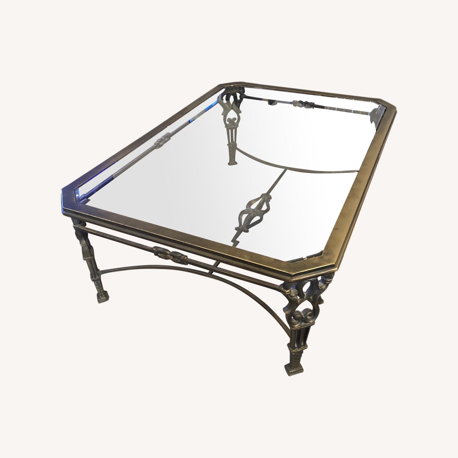 Seller's Notes:Elegant wrought bronze, glass-top coffee table in very good condition. Beveled-top glass top is removable, some minor scratches in the glass that are not immediately noticeable. Received from a family member and kept in a clean home. Remodeling our home and unable to keep this piece. Matching end table also available.
