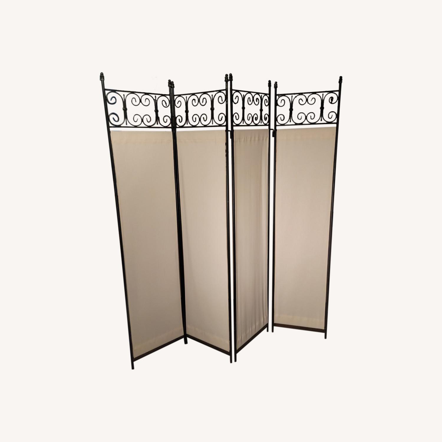 Seller's Notes:Wrought iron room divider made with 4 ivory colored canvas panels suitable for painting on. The panels detach for storage or transport. This piece has been wrapped and in storage, never used.