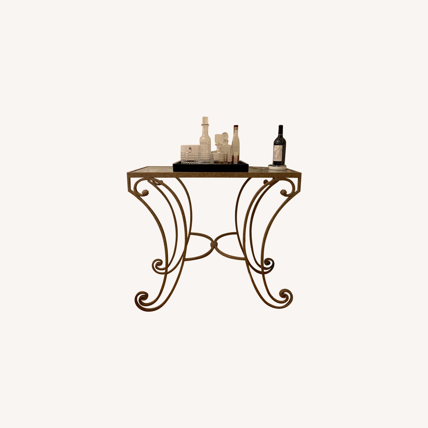 Seller's Notes:Tall wrought iron side table. Currently being used as a bar. In GREAT condition. The only mark is a paint mark, but once against a wall you can not see it.