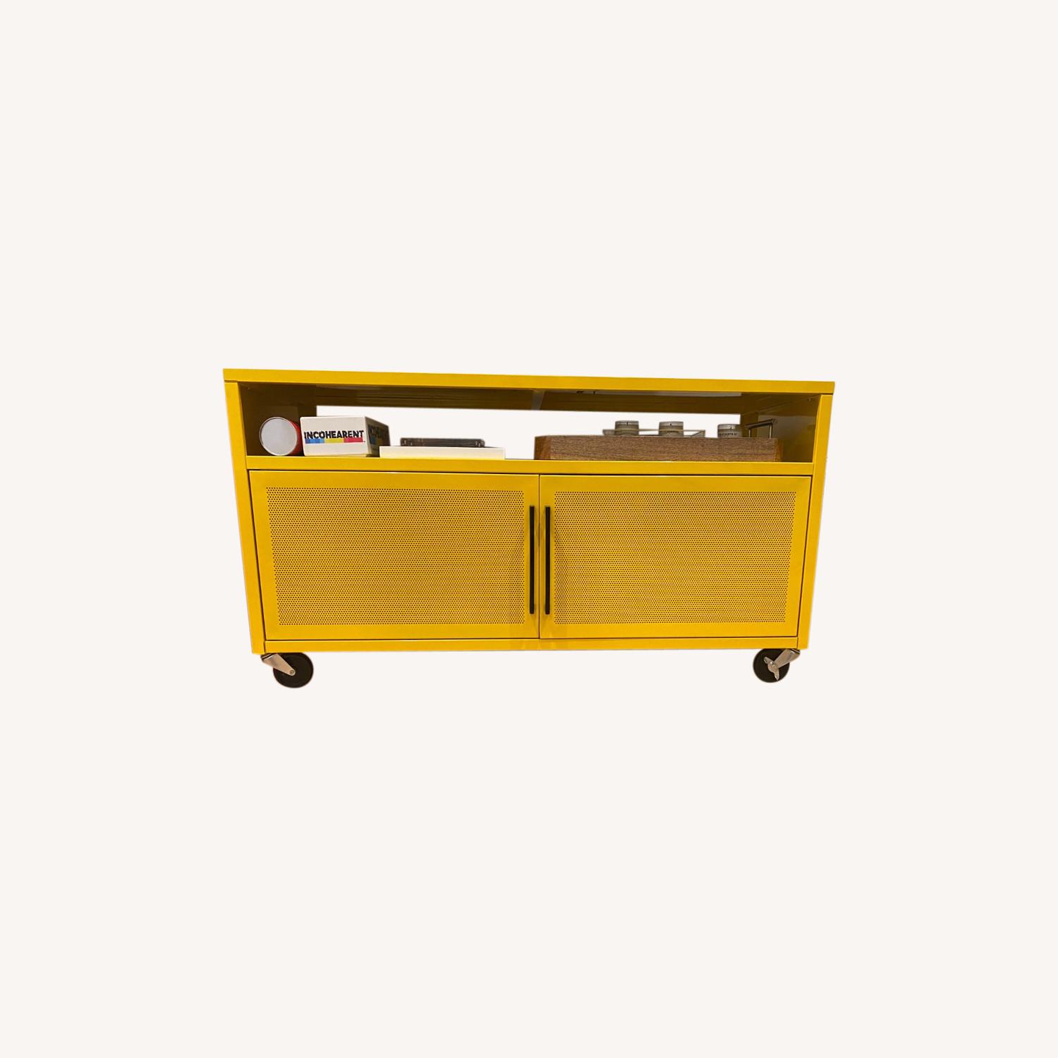 Seller's Notes:Bright yellow, modern TV console with lots of storage! The top is quite scratched, but the front of the console looks good as new! On wheels, so easy to move.