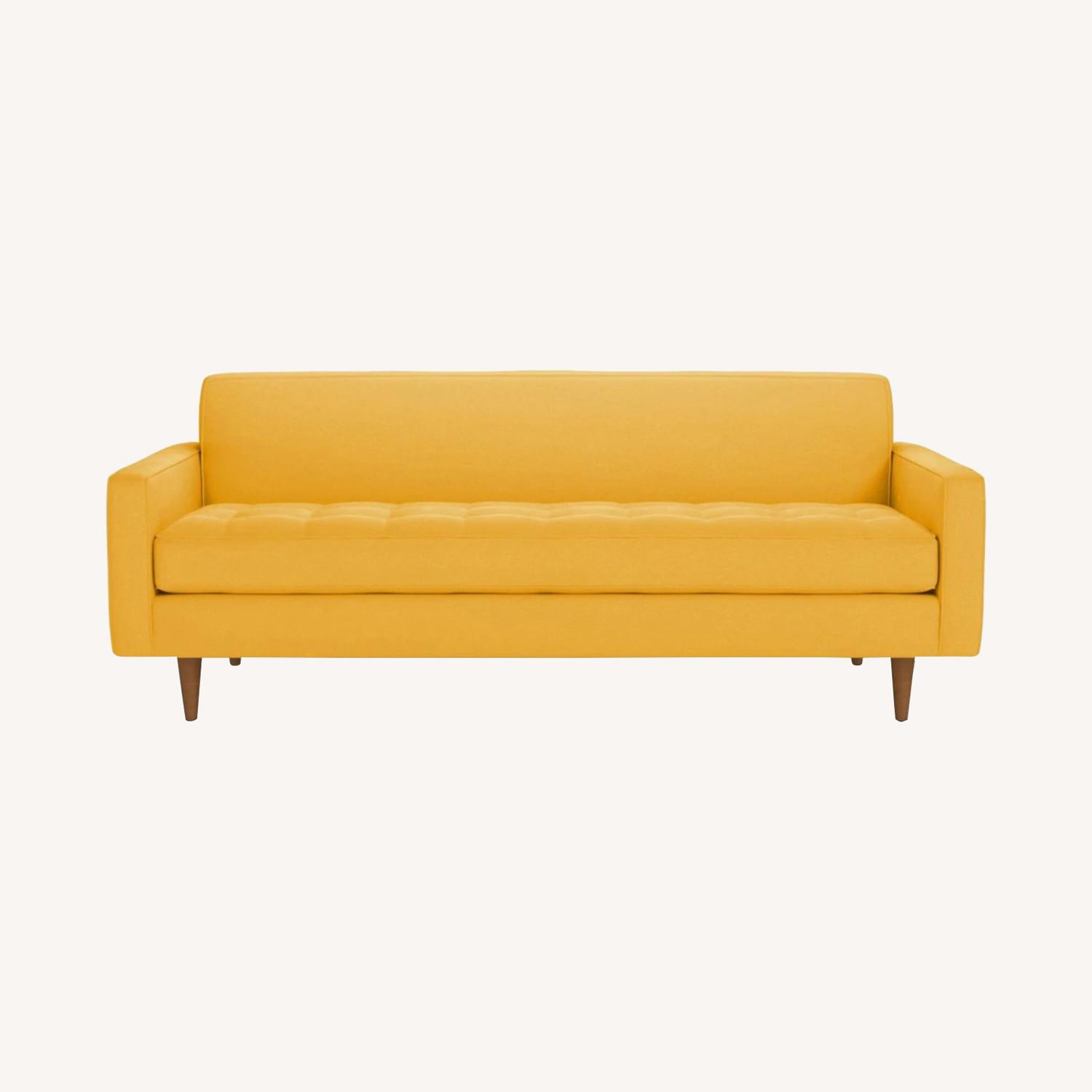 Seller's Notes:Brand new BEAUTIFUL yellow velvet sofa! (Originally $1900) We're so sad to have to get rid of it, but we mis-measured and we can't fit it into our apartment! So we need to sell it. This midcentury modern sofa boasts a hot retro vibe thanks to its sleek silhouette and button-tufted seat cushions. The backing is a solid piece straight across, offering a smooth look and feel. The piped edges create additional texture and the tapered wooden legs finish off the design. Made in the US using the finest craftsmanship. Made with hypo-allergenic, stain-resistant upholstery, you'll enjoy this sofa for years to come The Monroe is a perfect way to add a hip factor to any room. The clean lines and simple shape make it perfect for any small space. It packs a big punch without taking up a lot of square footage.