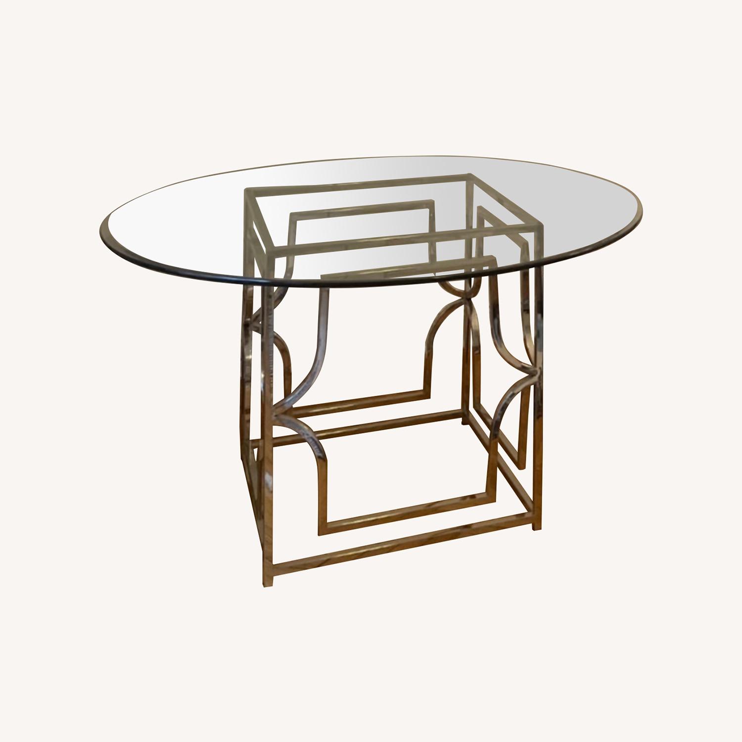 Seller's Notes:Round glass dining table with silver geometric base. Comfortably seats 6. Easy to clean and elevates a room. Minimally used with one scratch. Dining chairs not included.