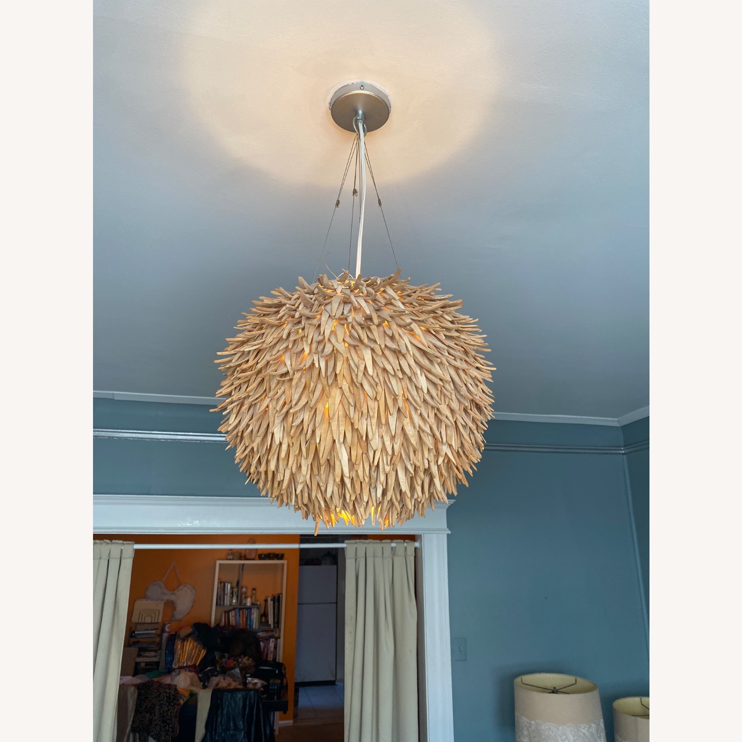 Seller's Notes:Carved coconut she’ll chandelier. Adjustable hanging length. Measurement is circumference. Holds one light bulb.