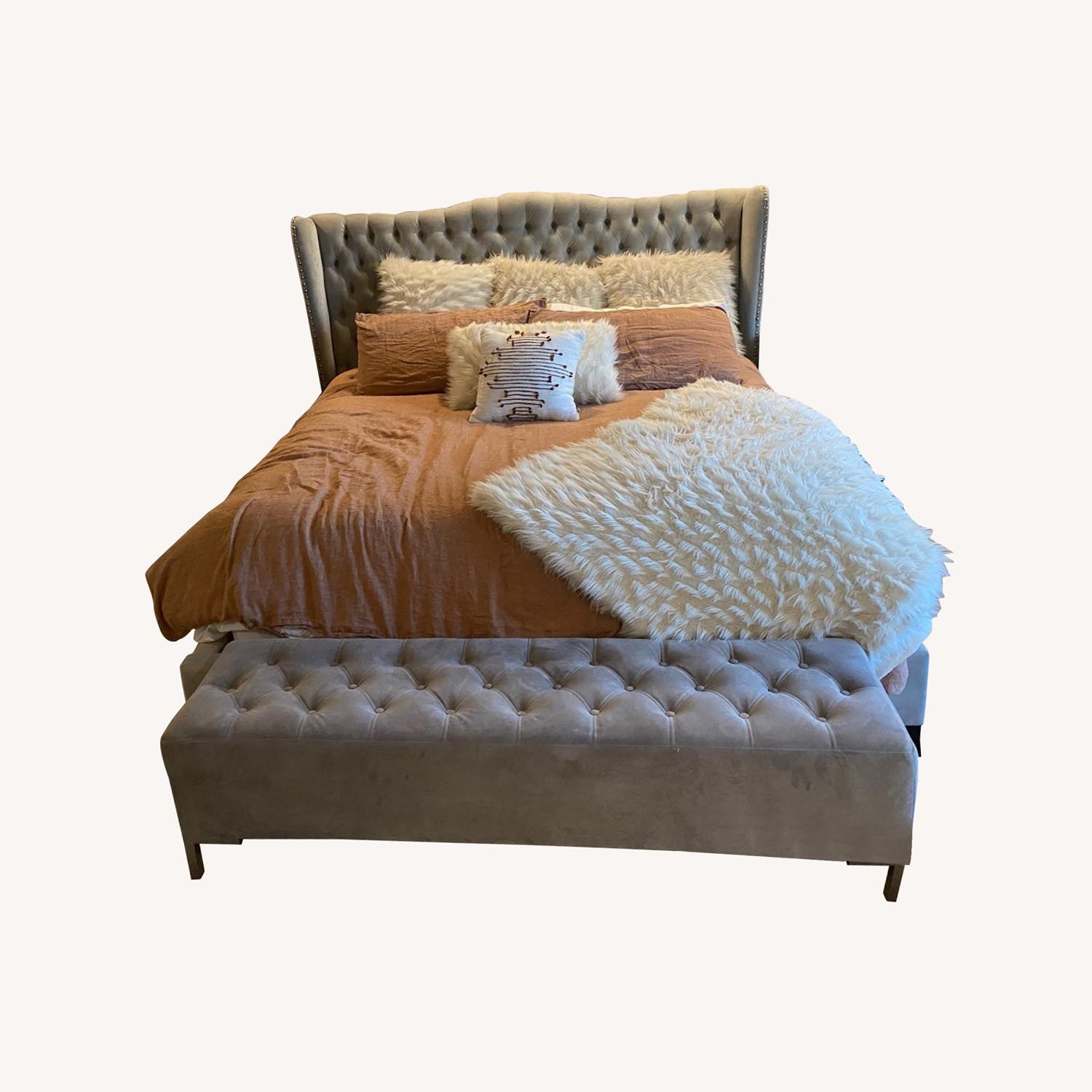 Seller's Notes:Excellent condition. Selling due to downsizing my space. Beautiful eastern king bed from Z Gallerie. With its graceful camelback silhouette, deep, hand-applied button tufts, and plush padding, you’ll rest luxuriously in our Jameson Bed. Trimmed with decorative nailheads, its winged sides and considerable height add a sense of opulence and drama to the bedroom. Shown in Bella Velvet Pearl with brushed silver nailheads.