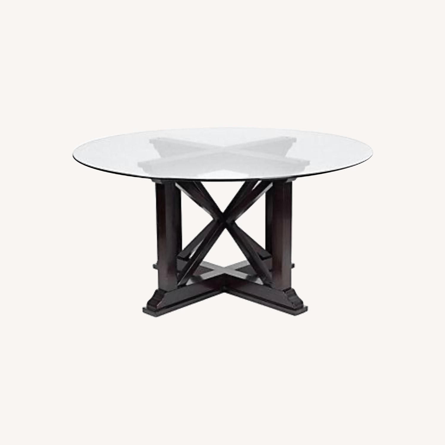 Seller's Notes:Z Gallerie Rencourt dining table in Molasses (espresso wood base) and glass. Color is true to the first photo— the others were lightened to better show scratches etc. Shows signs of wear but has a lot of great years left. We are selling 4 Scallop dining chairs from Z Gallerie as well if interested.