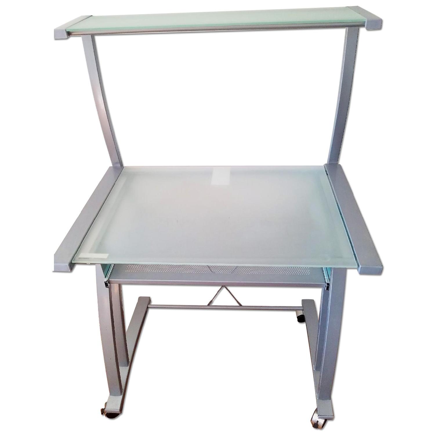 Seller's Notes:Skyline Computer Tower Desk- coated steel frame with frosted tempered safety glass tops with oversized pullout keyboard tray... has room for a mouse. Like new, barely used: Frosted, tempered safety glass tops is a non-scratch, non-stain, easy clean up desk surface Storage shelf is ideal for supplies and accessories and can accommodate most printers Silver capped casters (2 locking, 2 non-locking) Wheels allow for easy mobility.