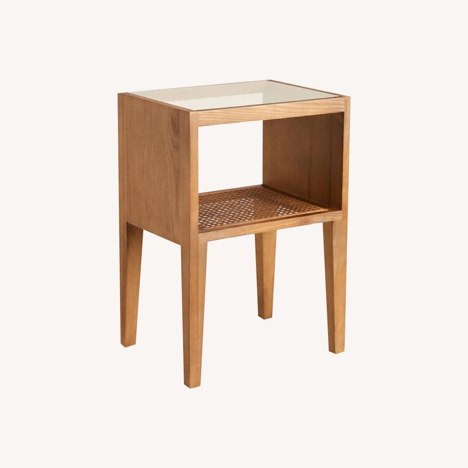 Square bedside table with legs. Rattan shelf and ash wood frame. SURFACE (80%) 80% ash wood 10% glass 10% rattan LEG (20%) 100% ash wood