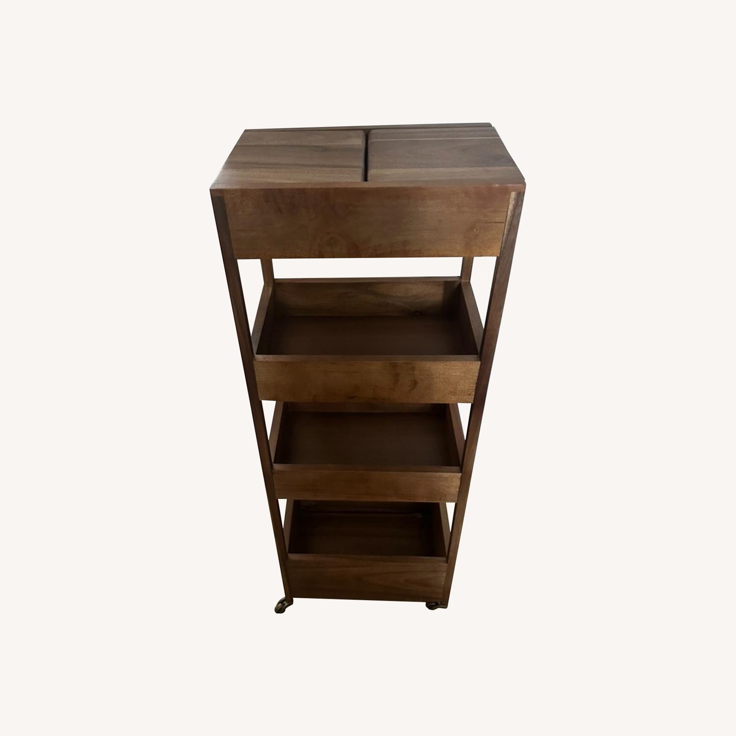 Seller's Notes:Acacia wood storage unit with four storage spaces at different heights and a top lid. Includes wheels for easy transport throughout the room.