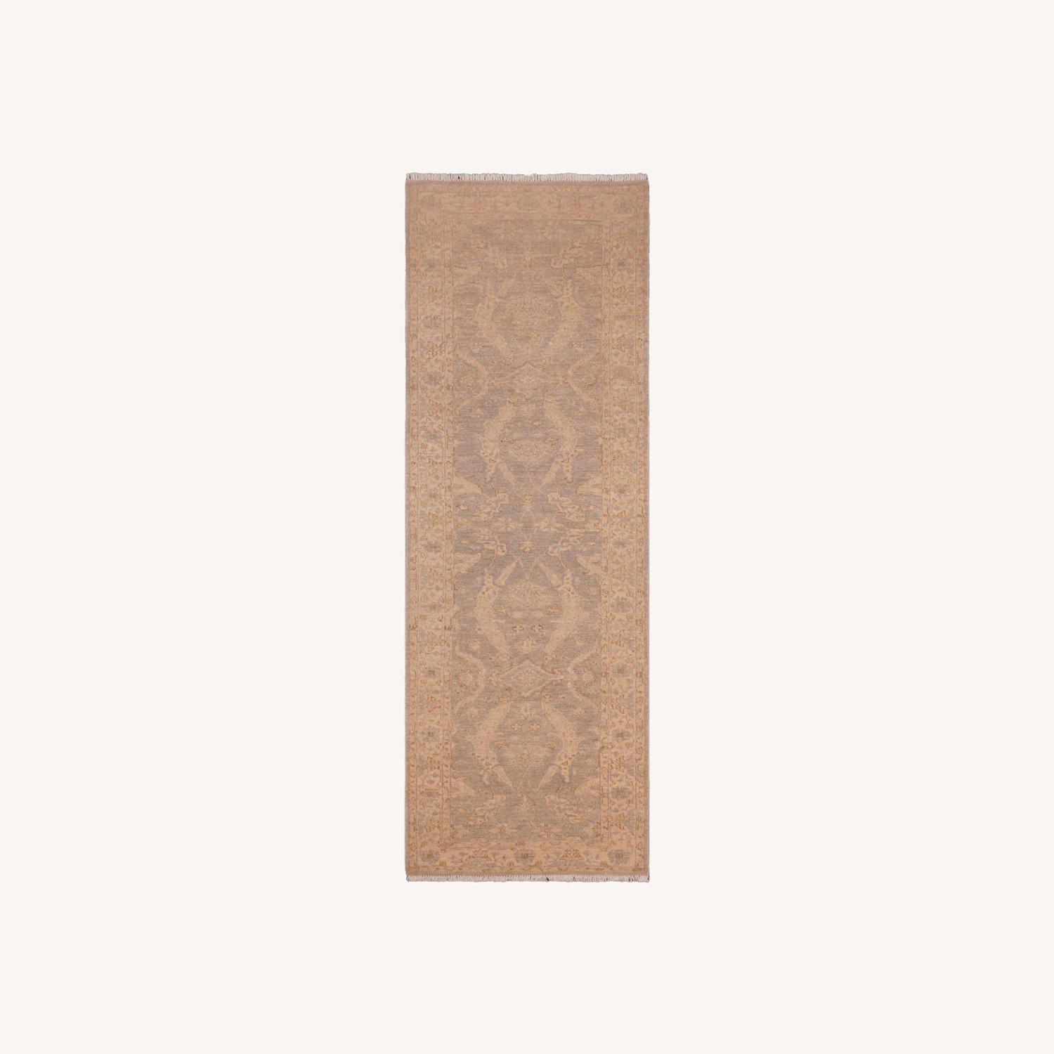 Seller's Notes:"Enhance the ambiance of your home with this magnificent Persian-influenced Turkish hand-knotted rug made by skilled artisans capable of creating the most exceptional vegetable dyes and hand-spun wool. This exquisite handmade rug is a one-of-a-kind Kafkaz, otherwise identified as Chobi, Chobi Peshawar, Oushak, or Ziegler rug. These handmade rugs are crafted in Pakistan utilizing superior-quality wool imported from Australia, New Zealand, and Korea in two types of weaves: the Persian weave and the Mori weave. This rug is meticulously crafted by hand using the finest natural vegetable dyes extracted from local plants. The artisans use a blend of hand-spun local and fine merino wool, resulting in a rug with a compelling texture, higher lanolin content, and longer staple. The artisans occasionally incorporate natural or artificial silk into the pile to enhance specific motifs. The finished product is an awe-inspiring flawless design execution and an understated palette that exudes elegance. Contemporary rugs draw inspiration from antique Persian designs and feature modern motifs with vibrant color tones. Hand-knotted with all-natural dyes, resulting in a unique abrash effect and subtle color variations in the pile. rugs are known for their stunning and vibrant colors, achieved through a process inspired by antique methods. The rug's pile is meticulously trimmed to a moderate thickness and then stone-washed and sun-dried, resulting in a natural sheen and pleasing color tones. Transform the ambiance of your room into a luxurious haven with this gorgeous rug featuring a beautiful color palette. This stunning rug features an intricate oriental design that showcases royalty and seamlessly complements any decor. Its hand-knotted construction and natural fibers provide a soft and comfortable feel underfoot, making it the perfect addition to any room. Product Details Rug Size: 2'7'' x 9'4'' Material: 100% Hand-Spun Vegetable Dyed Style: Traditional, Oriental, Kafkaz, Chobi, Oushak Colors: Grey Beige Gold Weave Type: Hand-knotted, Handmade Pile Height: 0.25 - 0.5 inch "