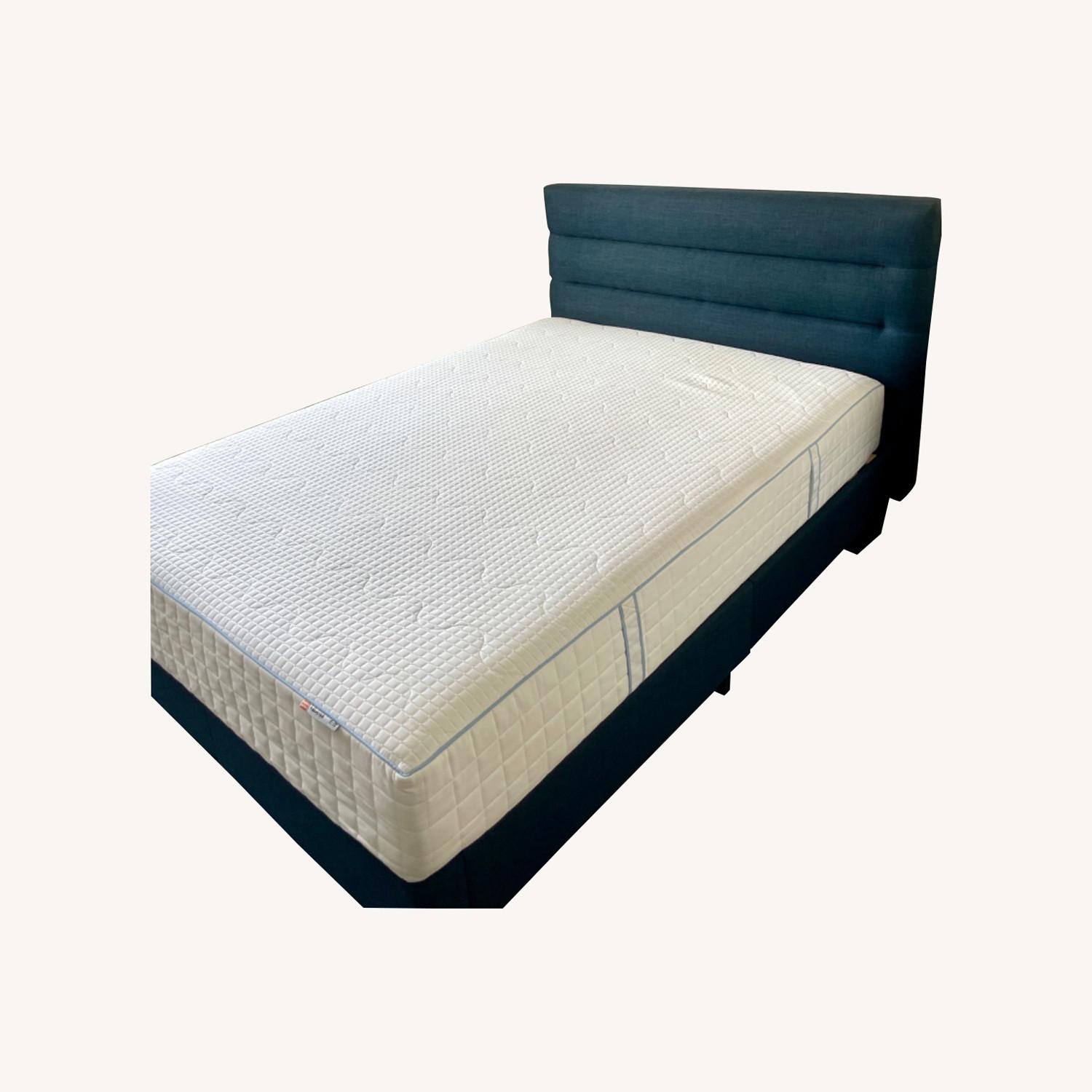 Seller's Notes:This is a full-sized bed frame with a perfect blend of modern design and comfort. It has a Navy blue upholstery that is durable while the sleek lines and padded headboard offer both support and a contemporary aesthetic. Key Features: - Navy blue fabric that complements any color scheme. - Durable construction and in great condition, ensuring longevity. - Easy assembly with all parts intact. - Mattress not included, giving you the freedom to choose one that suits your comfort. Condition: - Gently used with minimal signs of wear. - From a pet-free and smoke-free home. - No stains or tears in the fabric.