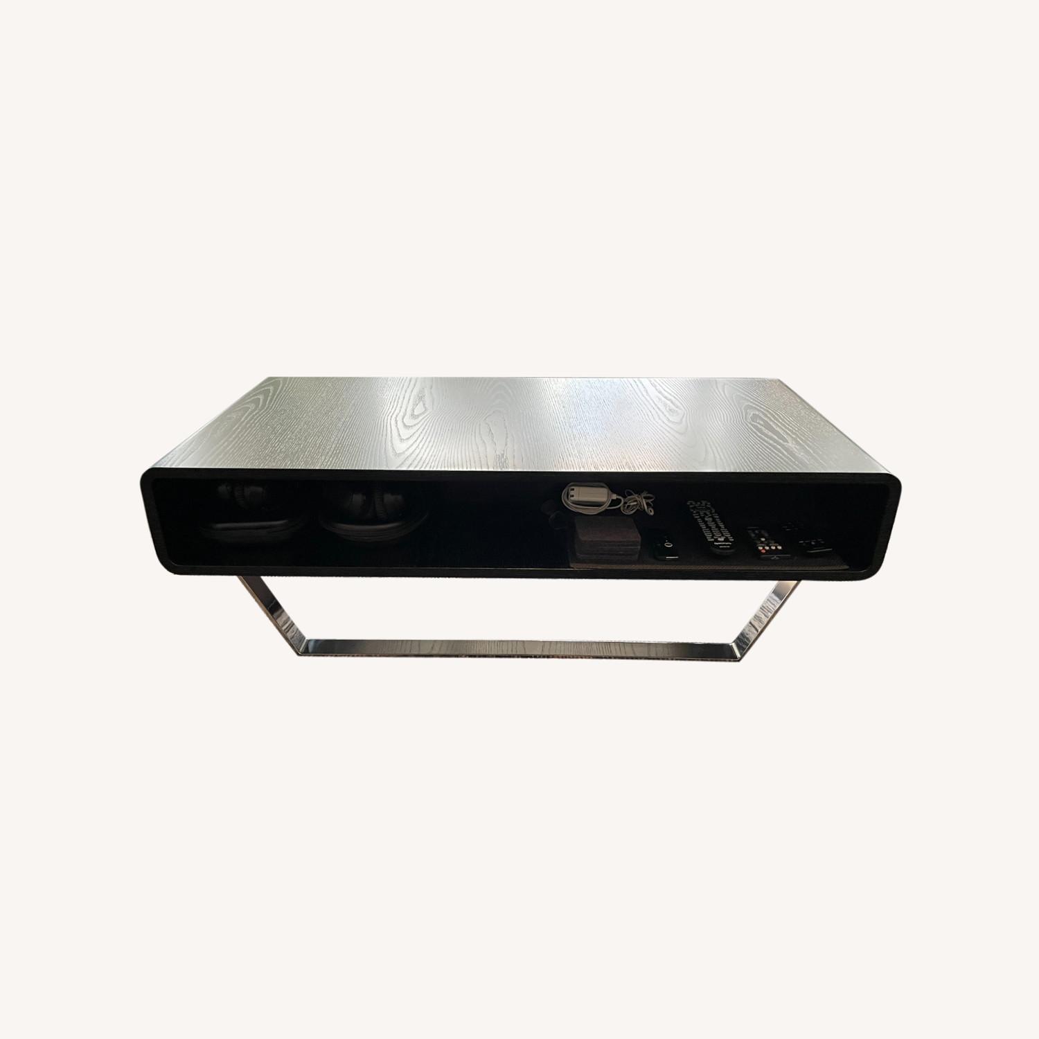 Seller's Notes:The Miles coffee table is black oak with a chrome sled leg base. Rounded edges frame an open storage shelf that opens on both sides but is divided lengthwise into two compartments.